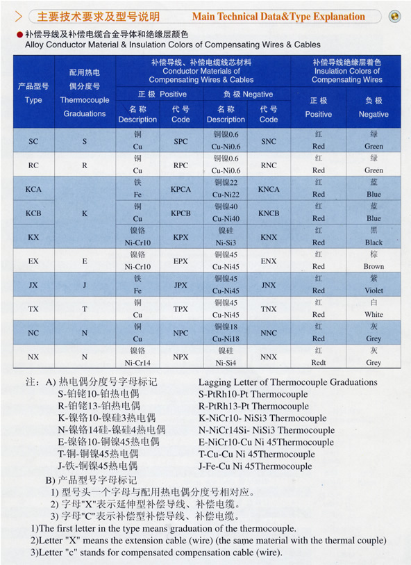 | 注:上述型号仅列出KX,其他如SC、KC、EX、BC、TX、JX只需改变型号一项即可, 阻燃型补偿导线型号前加ZR,ZR192为进口PFA材料, 屏蔽可采用镀锡铜丝屏蔽。 |