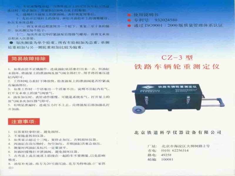 铁路车辆轮重测定仪,简称轮重仪 CZ-3型。是测量铁路车辆的超载、偏载重量的专用仪器,它适应于铁路车站、货场、厂矿企业等使用部门。具有体积小、重量轻,操作方便等特点。它不受时间、场地的限制,测量结果准确可靠。