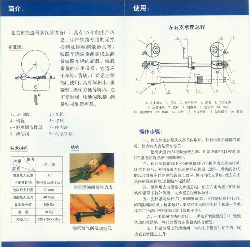 铁路车辆轮重测定仪,简称轮重仪 CZ-3型。是测量铁路车辆的超载、偏载重量的专用仪器,它适应于铁路车站、货场、厂矿企业等使用