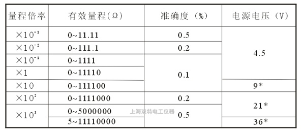 | 1.测量范围: 1Ω~11.110MΩ 2.准确度: 0.1% 3.内附指零仪: 电流常数<6×10-7A/mm 阻尼时间: <4s 4.电源: 4.5V(1号干电池3节) 5.外型尺寸: 258×213×144(mm) 6.质量: 3kg |