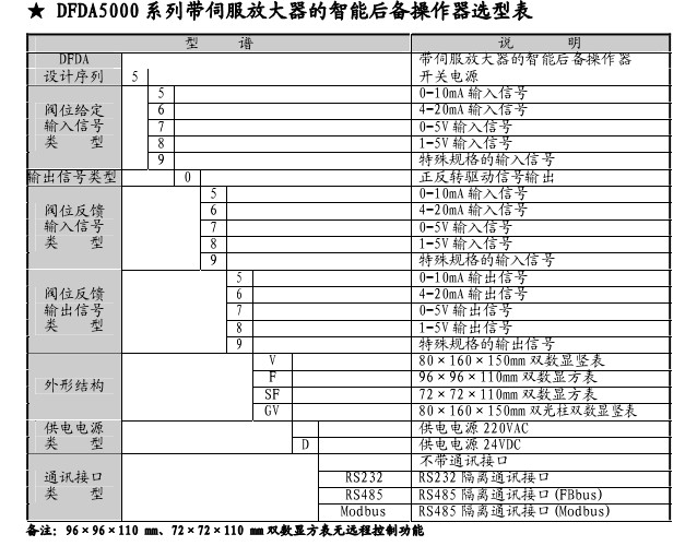 DFDA5000是伺服放大器、手动操作器和后备功能一体化智能产品,接收0-10mA/4-20mA/0-5V/1-5V阀位给定信号,输出正转、反转控制信号。适合于作为DCS系统回路调节控制输出和智能调节器控制输出的后备操作器使用。