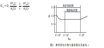 K除与旋涡发生体、管道的几何尺寸有关外,还与斯特劳哈尔数有关。斯特劳哈尔数为无量纲参数,它与旋涡发生体形状及雷诺数有关,图2所示为圆柱状旋涡发生体的斯特劳哈尔数与管道雷诺数的关系图。由图可见,在Re=2×104~7×106范围内,St可视为常数,这是仪表正常工作范围。当测量气体流量时,HLUG的流量计算式为