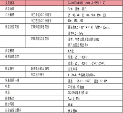 Pn,P-分别为标准状态下和工况下的压力kPa; Tn,T-分别为标准状态下和工况下的热力学温度,K; Zn,Z-分别为标准状态下和工况下气体压缩系数。 由上式可见,HLUG输出的脉冲频率信号不受流体物性和组分变化的影响,即仪表系数在一定雷诺数范围内仅与旋涡发生体及管道的形状尺寸等有关。但是作为流量计在物料平衡及能源计量中需检测质量流量,这时流量计的输出信号应同时监测体积流量和流体密度,流体物性和组分对流量计还是有直接影响的。 1、主要技术参数(见表1)