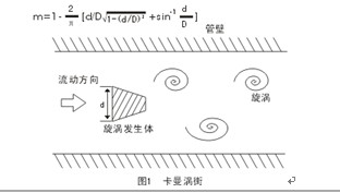 在流体中设置旋涡发生体(阻流体),从旋涡发生体两侧交替地产生有规则的旋涡,这种旋涡称为卡曼涡街,如图1所示。旋涡列在旋涡发生体下游非对称地排列。设旋涡的发生频率为f,被介质来流的平均速度为U,旋涡发生体迎面宽度为d,表体通径为D,根据卡曼涡街原理,有如下关系式: