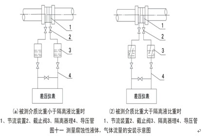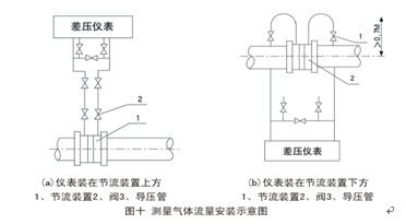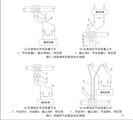 (1)仪表安装位置: 应将仪表装在节流装置上方,以使导压管内所产生的冷凝液流回输送管道。如图十(a)所示。 如果仪表不得不装在节流装置下方时,为了减少水分凝结在导压管内,从节流装置开始引出的导压管装有U型管道,上端至少应高于输送管道中心线0.7米。如图十(b)所示。 ![]() |