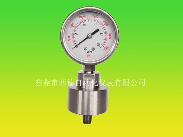 用途说明:隔膜压力表是由全不锈钢压力表与隔膜离器组成一个系统的隔膜压力表,能适用于测量强腐蚀,高温,高粘度,易凝固和有固体浮游介质的压力,以及对某些测量介质不能直接进入通用型仪表和便于清洗防止沉淀物质积聚的场合的压力检测。能满足药品生产质量规范(GMP)的要求,在制药,食品饮料,水处理等行业对卫生有要求的工艺流程中得到广泛应用。