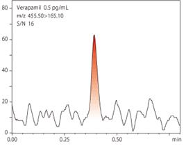 左侧数据为0.5 pg/mL 维拉帕米的MRM色谱图。在亚菲克区域的检测限附近,得到非常出色的灵敏度。
