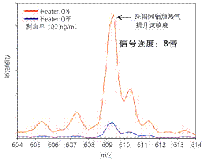 采用独有技术的高温加热离子源, 同轴加热气有助于离子化。如左图所示,同轴加热气使利血平的信号强度提高8倍。由于同轴加热气的作用,可以以ESI高灵敏度测定从高性到中・低性的宽性范围的样品。
