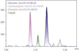 右侧数据为5 pg/mL医药品3种成分的MRM色谱图。所有成分的面积值重现性RSD < 6 %、低噪声水平与出色的选择性,使定量限达到数菲克以下。
