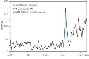 左侧数据为一个重要的类固醇类物质睾酮的M R M色谱图。类固醇类性较低,ESI法难以离子化,因此一般采用APCI法进行测定。但是,LCMS - 8 0 8 0的ESI法的适用范围广,即使是类固醇这样的中性样品,也可以与高性样品同样,进行高灵敏度分析。在定量限附近的2pg/mL,6次重复分析的面积值重现性RSD为4.34 %,高灵敏度、地进行了检测。