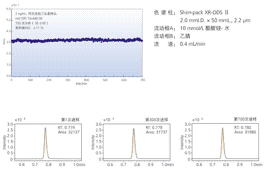 对于添加了阿托伐他汀的血浆样品,按左侧记述的前处理方法进行除蛋白质,使用LCMS-8080进行了700次连续分析。表示700次连续分析的面积值变动结果和第1、300、700次的MRM色谱图结果。峰面积值重现性为2.11 %RSD,证明了LCMS-8080的高耐用性和出色的峰面积重现性。