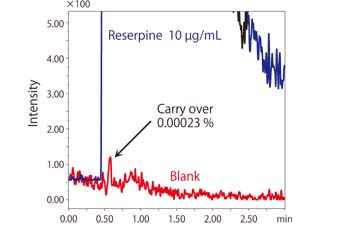 在左侧数据中,注入10μg/mL的利血平后的空白峰强度经浓度换算后为26 pg/mL,即使在注入非常高浓度的样品后,交叉污染依然被抑制在0.00023 %这样低的值。
