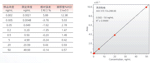 LCMS-8080所具备的高灵敏度将定量范围扩展至低浓度区域。从低浓度到高浓度,在宽浓度范围表现出出色的线性,实现了宽浓度范围的定量分析。希罗他唑的工作曲线在从2 pg/mL至50 ng/mL的动态量程上得到了R2 = 0.9999这样非常出色的线性。即使在低浓度下,也实现了相对误差10 %以下、面积值重现性15 %以下的结果,由此可见,从低浓度到高浓度的宽范围中可以进行的分析。如上所述,LCMS-8080兼备的灵敏度和定量性。