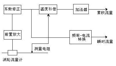 流体从机壳的进口流入,通过支架将一对轴承固定在管中心轴线上,涡轮安装在轴承上。在涡轮上下游的支架上装有辐射形的整流板,以对流体起导向作用,以避免流体自旋而改变对涡轮叶片的作用角度。在涡轮上方机壳外部装有传感线圈,接收磁通变化信号。