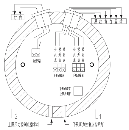 实际压力≥上限设定值,L2灯亮。(L2为上限压力控制点指示灯)