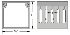 | 构造: | 由槽底及槽盖两部份组成,底槽两侧设出线孔,出线孔4.5mm,以组合后外部之宽、高为规格标准,每侧设有一条刀割式折痕。UL测试温度50℃。 | |