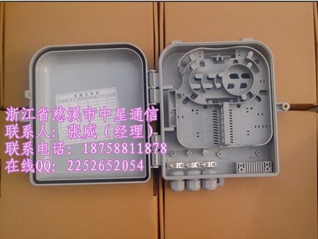 -1分32分纤箱,适用遇FTTH网络 电信网络 数据通信网络 局域网等 ,产品由优质工程塑料注塑成型,zui大能容纳安装36芯皮线光缆,具有防紫外线 冲击 防水等功能,有2根光缆人口和2根光缆出口,可壁挂和抱杆安装。