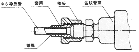 ● 旋下接头将直径为6毫米的金属导压管的一断锡焊在套筒上,然后旋紧接头使连接管密封,