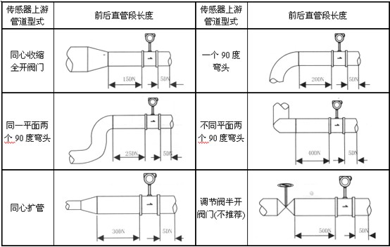 3、智能涡街流量计的上游侧和下游侧应留有较长的直管段,要求的上下游直管段长度随管道状况不同而异。涡街流量计的上游应尽量避免安装调节阀或半开阀门,应将调节阀或半开阀门安装在流量计下游5D以后。