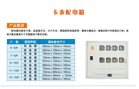 配电箱内装有卡表、总进线开关、分户开关、零线排和地线排等,箱体分悬挂式、嵌墙式和户外防雨式三种。具体户数及箱体尺寸可根据用户要求定制。