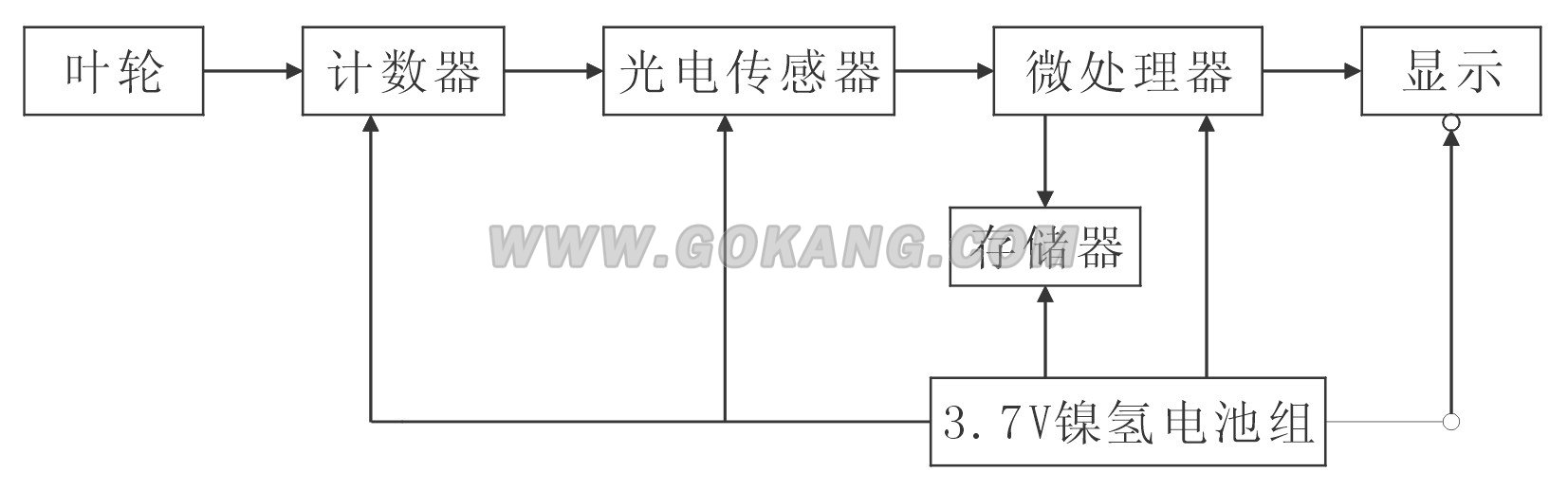 测量时,因为叶轮旋转对光电传感器形成遮挡,每遮挡一次就产生一个光脉冲信号,脉冲信号经计数器传送到微处理器进行运算处理后,经显示器显示或存入存储器保存。主要技术指标:
