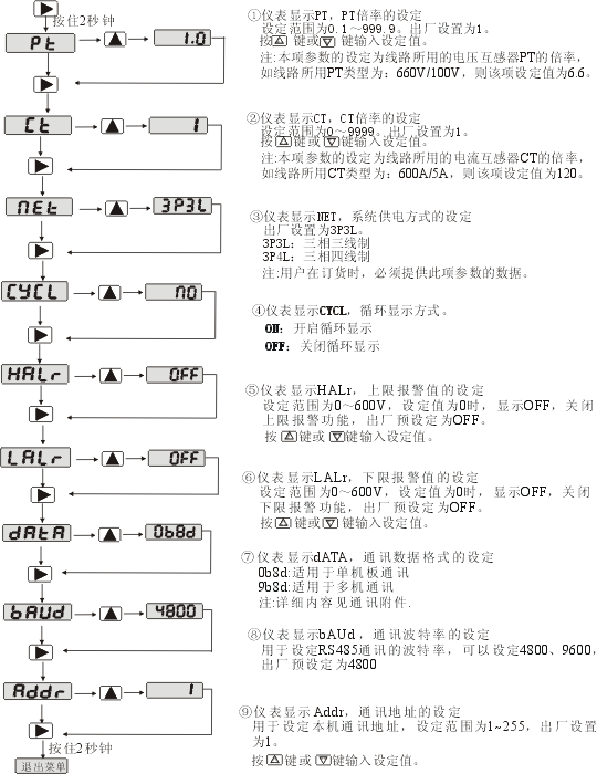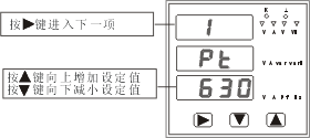 键持续2秒,本仪表自动进入设定状态,每按一下自动进入下一项参数设定,若退出设定,按住