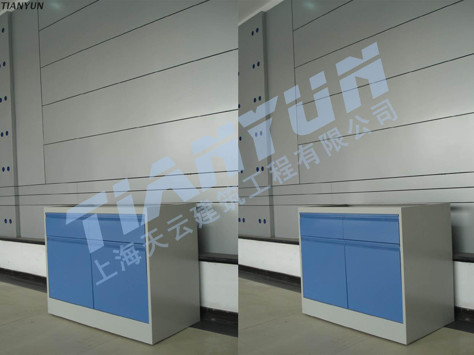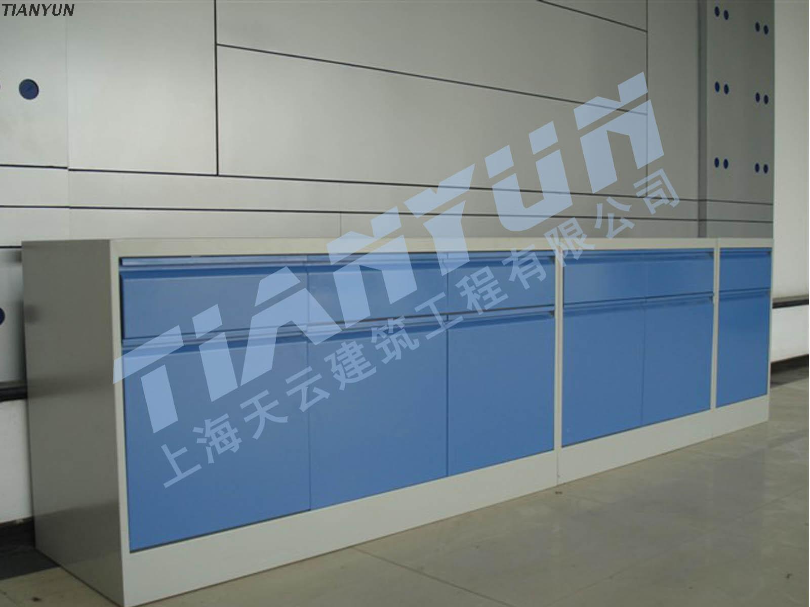 如图所示,此款为2500*750*800的满柜实验室边台,背板为灰色,柜门为浅蓝色,一字型隐藏式拉手,整洁、美观、大方。被广泛应用于生化实验室、微生物实验室等