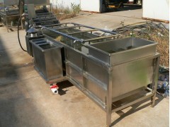 ,清洗槽盒低贮水箱中的水经高贮水箱过滤后,由离心泵加压再输入水槽。所耗水量较低,符合节水要求。所以附属装置及构件皆可简便安装、拆卸和清洗。通过而至三台的链接,可使清洗、去异物、杀菌、冷却等工艺连续进行