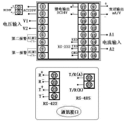 | 交流电压表,输入类型为0~,继电器控制输出,带RS-485通讯,带上限继电器报警输出,带DC24V馈电输出。 |