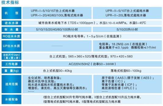 UPR系列纯水机是严格按照标准双级反渗透工艺—双泵双膜+中间水箱—制造的一套精巧的实验室纯水制备系统,源水水质较差工况下产水水质电导率可稳定在1~5μs/cm,适用于实验器皿冲洗、试剂配制、微生物检查、生化分析等常规实验之定性/定时分析项目。