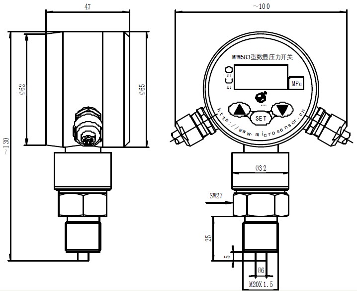 MPM583型数显压力开关是集压力测量、显示、控制于一体的智能数显压力控制产品。该产品为全电子结构,前端采用带隔离膜片的压阻式压力传感器,输出信号由,低温漂的放大器放大,送入的A/D转换器,转换成微处理器可以处理的数字信号,经过运算处理的信号控制两路继电器,对控制系统压力进行测控。该产品使用灵活,操作简单,调试容易,安全可靠,广泛应用于水电,自来水,石油,化工,机械,液压等行业,对流体介质的压力进行测量、显示和控制。