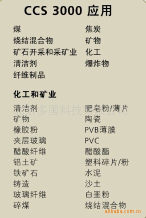 煤、焦炭、烧结混合物、矿物、矿石开采和采矿业、化工、清洁剂、爆炸物、橡胶粉、夹层玻璃、醋酸纤维、铝土矿、铁矿石、铸造、玻璃纤维、碎煤、肥皂粉/薄片、陶瓷、PVB薄膜、PVC、醋酸酯、塑料碎片/粉、水泥、沙土、白垩粉。