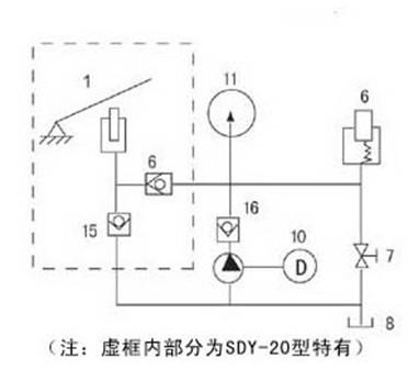 电动机10经减速箱13及斜盘来驱动双柱塞泵,液压油经吸油阀15及出油阀16压入大油缸中产生压力,电接点压力表11显示并控制系统中压强,达到所设定的压力后电动机10自动停止工作,松开放油阀7卸压后,大活塞6自动复位。
