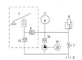 电动机10经减速箱13及斜盘来驱动双柱塞泵,液压油经吸油阀15及出油阀16压入大油缸中产生压力,电接点压力表11显示并控制系统中压强,达到所设定的压力后电动机10自动停止工作,松开放油阀7卸压后,大活塞6自动复位。