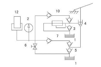 油筒1中的油,经小活塞4,再经低压阀3、10,高压阀5、7进入大活塞12,压力由压力表2显示,松开放油阀6,大活塞12中的油在压力的作用下回到油筒1中,大活塞12复位。