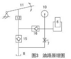 工作时,放油阀7关闭。摆动手动压把11,油液从油池8中经单向阀15吸入,通过出油阀16压出进入大活塞6中,这样不断续存能量,而形成高压油,并在压力表10中显示出来,当开启放油阀7,即可卸荷。