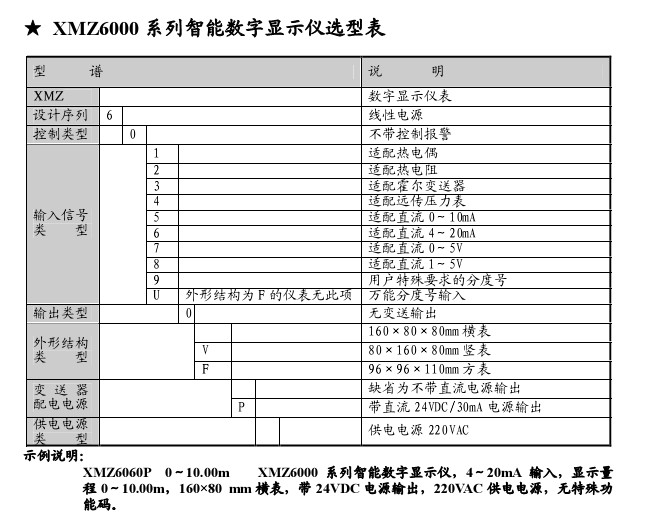 ★ 功能特点 ※ 输入信号 通过简单的软、硬件设定,即可适用于以下任意一种输入信号。 ● 热电阻:Pt100、Pt100.0、Pt10、Cu50、Cu100。 ● 热电偶:K、E、S、B、J、R、T、N,并带自动冷端温度补偿。 ● 标准信号:0-10mA、4-20 mA、0-5V、1-5V,线性或开方信号。 ● 远传压力表:30-350W,信号偏差可现场按键修正,即设即用。 ● 一般线性非标信号:0-60 mV以内或0-60 mV以上0-5V以内任意信号,可按键即设即用。 ● 其它特殊订做的非标信号。 ※ 单片机智能化 ● 零点和放大倍数自动跟踪,长期运行无漂移。 ● 仪表量程等全部参数可按键设定。 ● 超量程指示,断线指示等故障自诊断功能。 ★ 技术指标