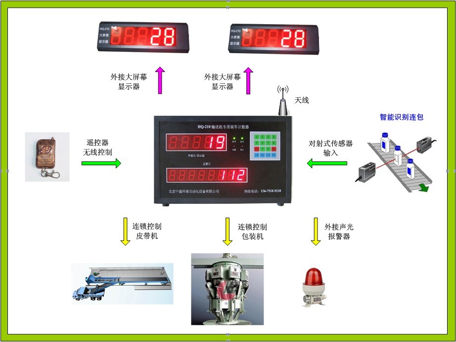HQ-210主要用于水泥厂、化肥厂、饲料厂、面粉厂、糖厂、粮食企业等皮带机输送机/装车机上的产品出库、装车计数点包场合;工厂生产流水线上产品计数;