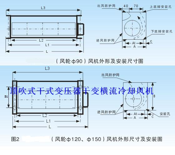 1、 冷却风机般安装在干式变压器下夹件旁边,将底下及外面的冷空气吹向干式变压器的线圈内,使干式变压器能充分冷却。安装时应根据冷却风机的出风角度(与水平夹角约为135°)及出风口位置,使风机的出风能顺利地入干式变压器的低压线圈间的风道,从而使散热效果。
