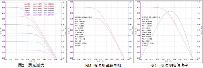 图2、图3、图4分别是弱光测试、双光强测串联电阻Rs和两次测量峰值率Pm,这对电池生产线改艺、提电池性能具有重要意义。