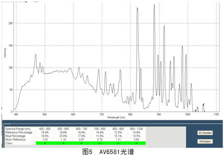 采用专业光纤光谱仪对AV6581光谱行测试,如图5所示,光谱不匹配度为22%,达到A光谱标准(≤25%)。