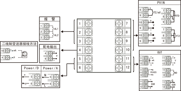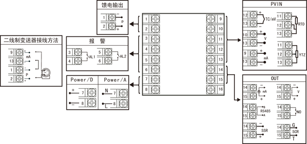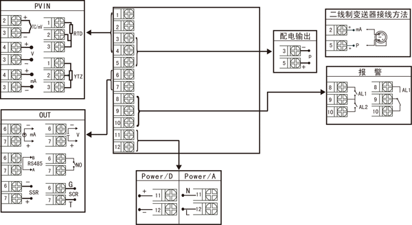 | 注:上述接线图中在同一组端子标有不同功能的,只能选择其中一种功能。如RS485通讯功能和控制输出功能在同一组OUT接线端子上,只能选择一种。若两者需同时存在时,控制输出只能选择开关量输出且接线端子在AL2上。 | ||||||||||||||||||||||||||||||||||||||||