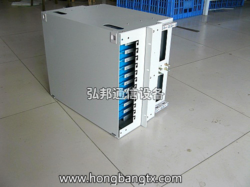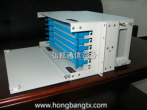 - 结构特点:用19″标准安装界面,适用于多种机架、机柜上的安装;采用金属结构,表面涂装静电喷塑,结构轻巧,外形美观;全模块化设计,全正面化操作,安装灵活、施工维护方便;抽拉式设计,集熔接配线一体化的熔接配线模块;适用于束状和带状光缆;每盘可卡式安装12个FC,SC及ST适配器,适配器正面呈30°角,既保证拉光纤的曲率半径,又可避免激光损伤眼睛;模块可取出至设备外操作,简单方便;光缆和尾纤均具有2m以上的盘储空间