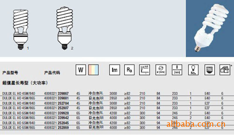 | DULUX EL HO 65W/840 | 65 | 冷白色RL | 4200 | 82 | E27 | 94 | 246 | 6 |