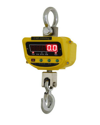 将电子吊秤的吊环挂在起重机的吊钩上,当电子吊秤的吊钩上挂上物品后,在秤体内的传感器受到拉力产生变形,传感器内的电流发生变化,然后这个变化的电流通过A/D转换,再通过发射机将无线电信号发出,根据无线电管理委员会的规定,电子吊秤一般是用230MHZ和450MHZ发出的,接收机接收到信号以后传输给仪表,然后经过仪表的转换计算,终显示出来
