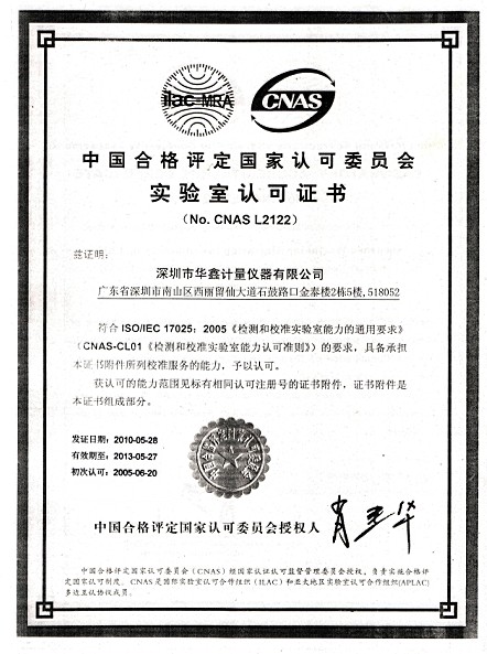 华鑫计量校准实验室已获得中国合格评定国家认可委员会(CNAS)的认可,认可证书编号为:NO.CNAS L2122(认可范围见附表),其校准、检测数据可追溯到国家及国际标准,所出具的证书、报告获得国际实验室认可合作组织多边互认协议(ILAC-MRA)其他成员的承认和认可,完全满足ISO/IEC17025和ISO9000体系的要求。