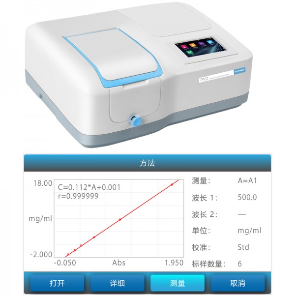 PV2单光束可见分光光度计通过简单的参数设定,方便地进行光度分析、定量分析,文件管理,数据U盘导出,配合专业的Mapada的扫描分析软件,可实现全更多功能。主机功能:光度测量;定量测量;文件管理;系统管理;性能验证