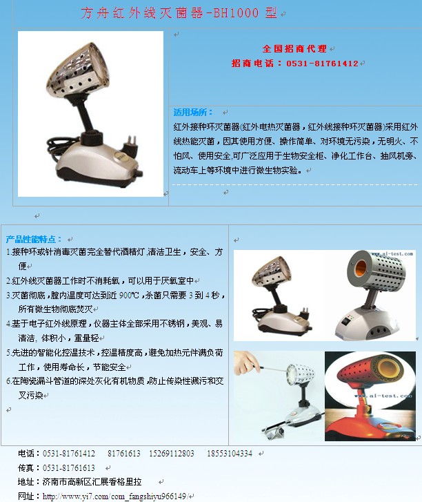方舟BH1000-A型红外线灭菌器主要针对各大医院,组培室接种器械消毒,生物安全柜中专用,例如手术刀,剪刀,镊子,接种针,接种环等.目前H7N9禽流感病毒来的凶猛,再次提醒我们在做实验时需要认真做好消毒工作,方舟品牌红外线灭菌器,能够在短时间内杀灭所有微生物细菌,让我们的实验做到无菌环保,放心.请选择正规品牌.订购热线br />