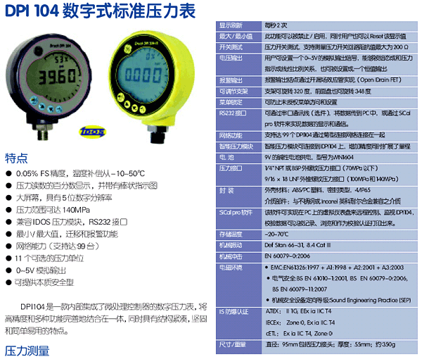 德鲁克DPI 104数字压力表精度:-/+0.05%FS,比压力表DPI 705精度更高.温度补偿范围:-10~50℃分辨率:zui大5位数字。可以和德鲁克手泵TP1-40搭配使用,形成简单的校验仪,经济实惠。现货供应,欢迎来电!