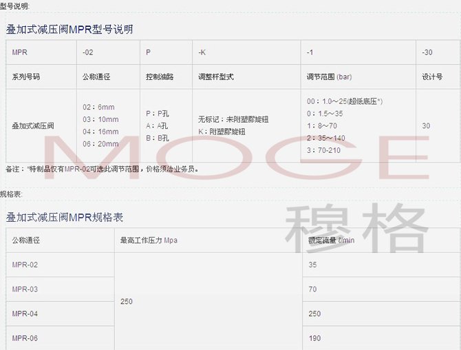 1、叠加式减压阀MPR有如下型号:MPR-02P-K-0-30,MPR-03P-K-0-30,MPR-04P-K-0-30,使用说明:1、叠加式减压阀MPR推荐粘度;正常工作